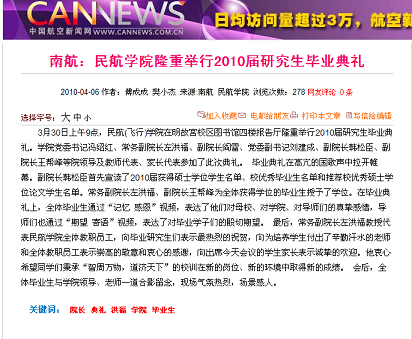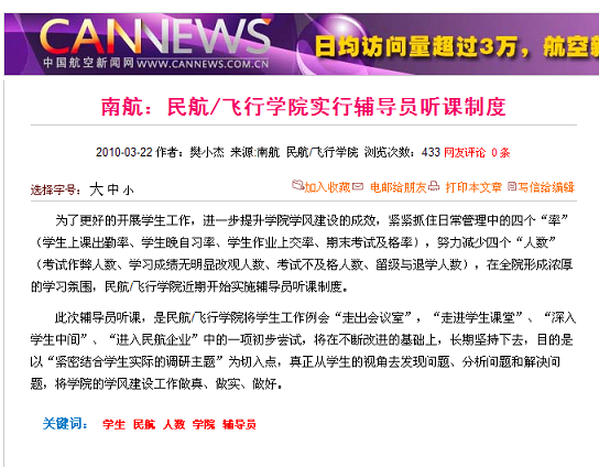 中国航空新闻网分别在3月22日和4月6日对 三级片 辅导员听课制度和2010届研究生毕业典礼等情况进行转载报道。报道详细介绍了 三级片 两项活动的具体内容,真实展现了 三级片 学生工作开展的广度和深度,提升了 三级片 学生工作的影响力。