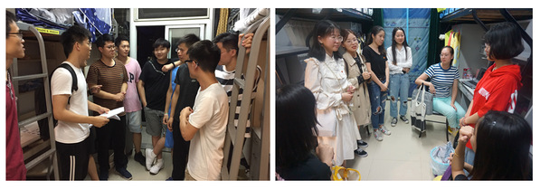 刚刚结束白天的迎新活动,学长学姐便来到东区和南区宿舍,开展“学长学姐进宿舍“活动,及时了解新生们的问题和需求。活动伊始,学长学姐们富有创意的自我介绍迅速缓解了生疏感,调动了现场气氛。接着,同学们就选课、研究生生涯规划等方面问题进行提问,学长学姐们也结合自身科研和生活经验给出建议。最后,研会、党建和班级的负责人简单介绍各自组织的部门架构和特色活动,鼓励大家积极参与学院研究生工作,找准科研目标的同时丰富课余生活。