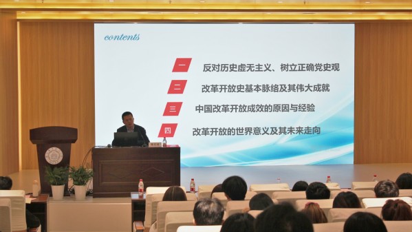 陈红桂从分析历史虚无主义的表现及危害出发,强调树立正确党史观的重要性,并以此为基础带领同学们梳理改革开放基本脉络。他以我国基本矛盾的变化为切入点,通过讲述改革开放的业绩与成就,引出了改革开放对中国、乃至世界的意义。他从历史经验中的观念革命与目标定向、中国特色社会主义的必由之路与全新探索和伟大实践的新时代方案三个进行分析,系统阐述了中国改革开放成效的原因与经验。