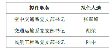 经各支部充分酝酿、党员民主推荐、学院党委考察,学院党委会讨论研究,拟确定张军峰、胡荣、陆中同志担任空中交通系、交通运输系、民航工程系党支部书记。现予以公示: