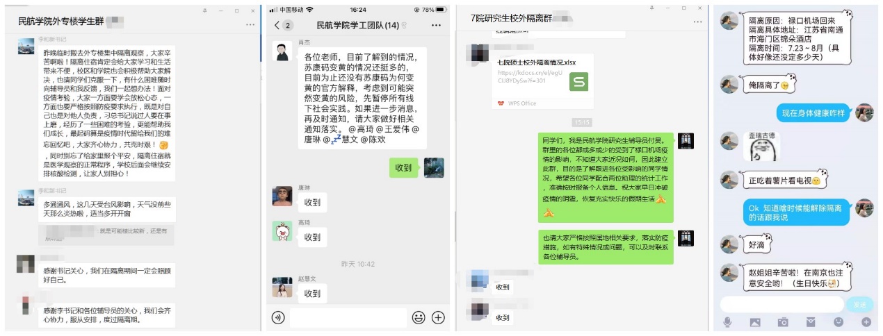 目前,学院有408名学生因复习备考、社会实践、科研、实习等原因留校,其中本科生71人,研究生337人。在疫情反复、极端天气频发的关键时期,三级片 推出一系列有速度、有力度、有精度的暖心之举,多渠道加强与学生的联系,关心关爱学生。学院领导直接对接外专楼隔离点学生,第一时间送去学院的关心,通过微信群及时了解学生动态和诉求并协调处理;各年级建立校外医学隔离学生联系群,关注校外隔离学生的身心健康;院领导及辅导员先后走访慰问留校学生、给校内隔离点学生送防疫生活物资、为学院实验室配发防疫消毒用品;点对点了解河南籍学生家中情况,关心实践实习学生,落实关爱政策措施;执行在校本研学生每日信息更新制度,做到在校学生信息“一日一更新”、返乡学生离校-途中-到家“全过程关注”。在院领导及学院老师的关心引导下,留校学生落实学校各项防疫要求,积极配合完成各项疫情防控工作,并始终保持良好的生活和学习心态。