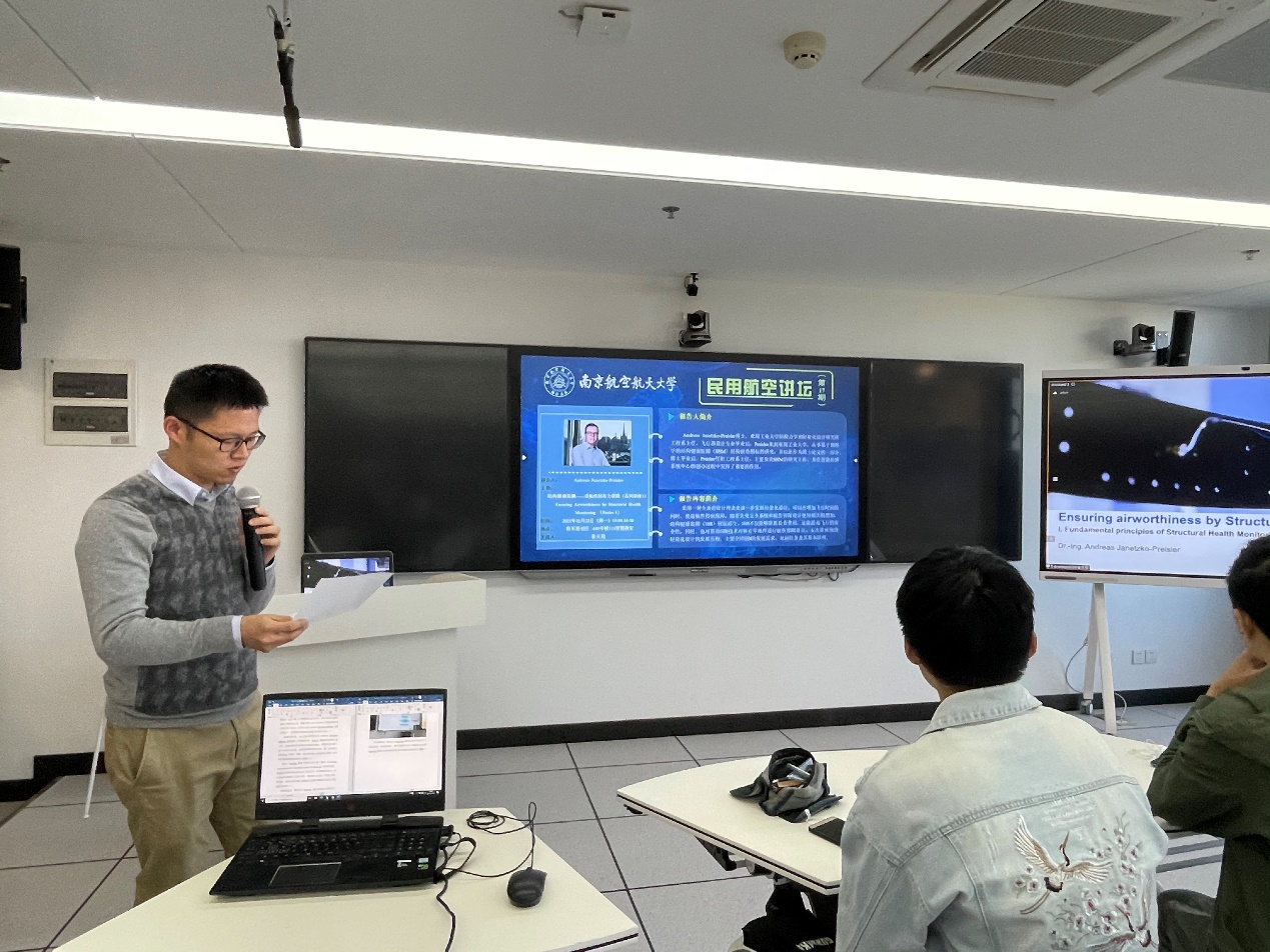 讲座开始前,黄天翔老师首先对Andreas Janetzko-Preisler及其讲座内容进行了简单的介绍。Preisler博士任职亚琛工业大学,主要负责结构健康监测的研究工作。Preisler博士的讲座题目为《Ensuring airworthiness by Structural Health Monitoring (Series 1)》。本次讲座以轻量化设计的发展历程为背景,主要介绍了结构健康监测的发展需求、对应任务及其基本原理。