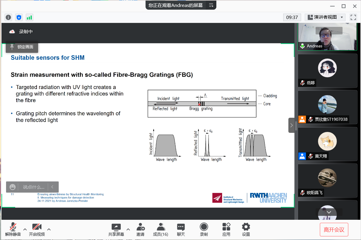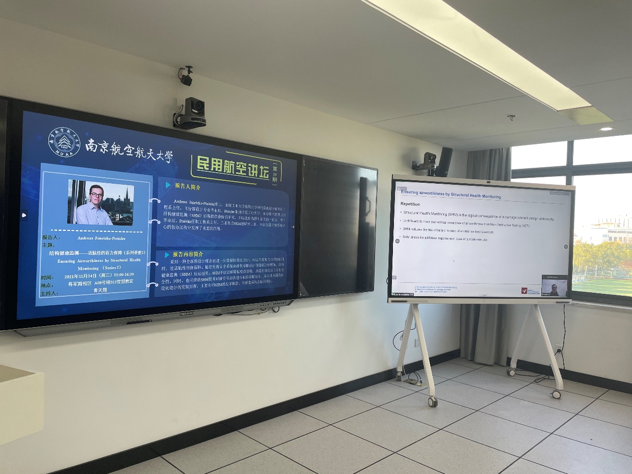 11月24日下午,“民用航空讲坛”第十九期讲座成功举行,讲座采用了线上线下相结合的形式,线下会场设置在将军路校区A08号楼312智慧教室。本次讲座由三级片 黄天翔老师主持。德国亚琛工业大学结构力学和轻量化设计研究所(SLA)工程系主任Andreas Janetzko-Preisler受邀为师生带来了一场围绕结构健康监测展开的线上讲座。