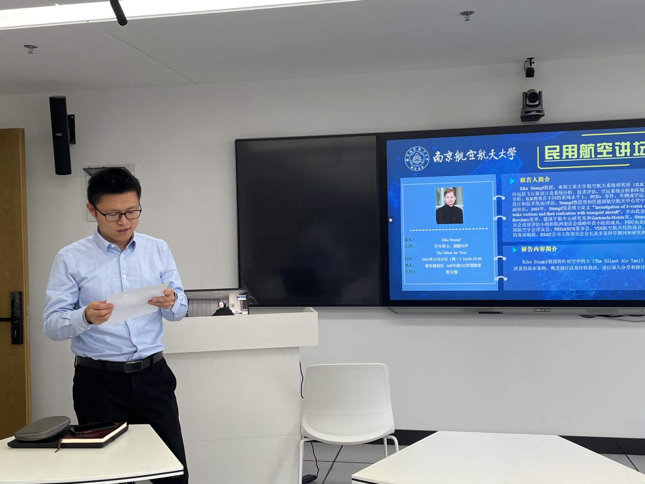 讲座开始前,黄天翔老师对Eike Stumpf教授进行了详细的介绍。Eike Stumpf教授现任亚琛工业大学航空航天系统研究所(ILR)所长,其研究方向主要包括飞行器设计及系统分析、技术评估、空运系统分析和环境友好型空中交通分析。他是欧洲委员会进展评估小组和欧洲委员会战略审查小组的成员,《AEAT日报》的客座编辑,ESAT公司工程委员会会长及多家科学期刊和研究机构的审稿人。