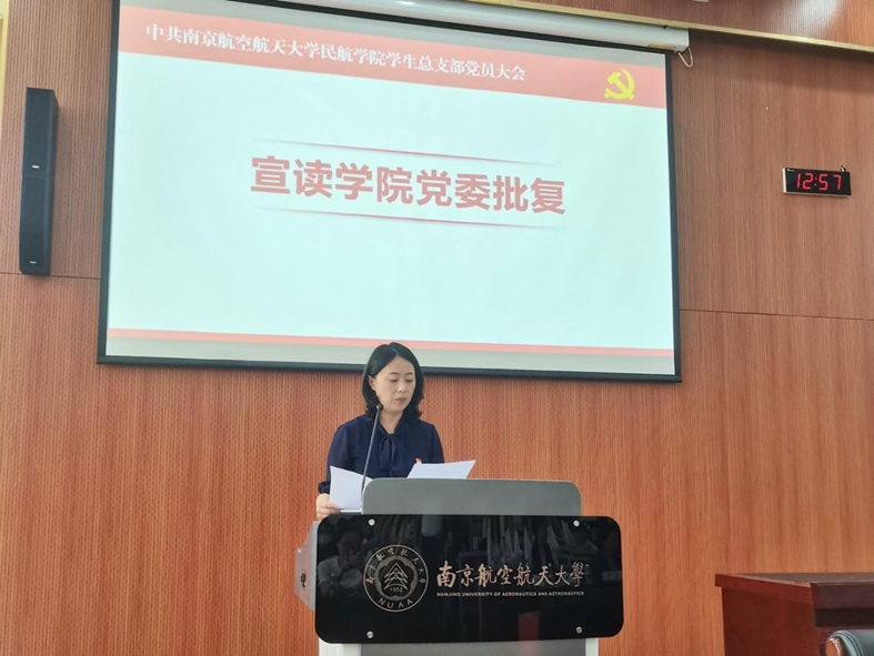 王艳代表上一届学生党总支委员会向大会作题为《砥砺奋进新征程,奋楫笃行开新局》的工作报告。报告全面回顾和总结了上一届学生党总支的工作,同时提出了新一届学生党总支今后的工作目标和主要任务,即以组织建设为基础,增强发展凝聚力,以创新驱动为支撑,激活发展内驱力,以民航特色为桥梁,汇聚发展新合力。