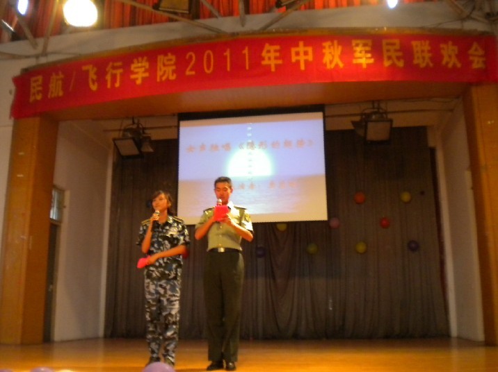 2011年9月12日,下午14点,民航/飞行学院全体新生在大学生活动中心举行2011年军民中秋联欢会。军训团副参谋长、学院团委书记杨玲老师、傅成成老师、张建辉老师、夏昌青老师及全体教官参加了联欢会。军民联欢会由教官胡嘉旭和学生刘婷婷共同主持,整台晚会完全由新生自己设计、自己编排,展现了新生多才多艺,积极向上的良好精神面貌。