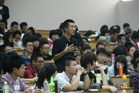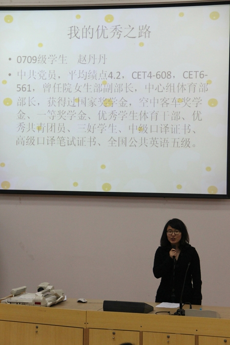 06级校友叶超在现场讲述他们的优秀故事。他们都强调只有坚持学习、坚持努力才能向目标靠的更近;只有忍得住辛苦、耐得住寂寞才能离未来那个优秀的自己靠的更近。听了学姐学长的介绍,同学们对自己的发展方向更加清晰,也对自己的未来充满信心。