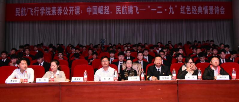 12月13日晚,民航/飞行学院在将军路校区一号楼四楼报告厅举办了2019年素养公开课:中国崛起,民航腾飞—“一二·九”红色经典情景诗会。艺术学院李珊珊老师,三级片 团委书记肖杰,辅导员朱岚、吴泊鋆、王爱伟、万旅、杨九洲、李卓伦、李耀堂以及三百余名同学参加了此次诗会。