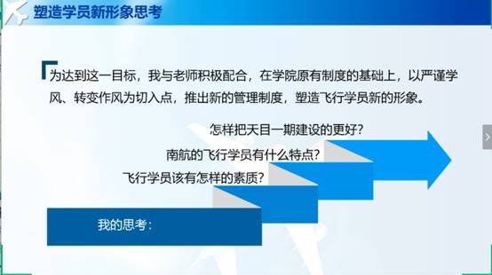 飞行2019级张博昱同学分享了天目湖开拓者的故事,作为天目湖校区最早的一批学生,他不仅适应了飞行学员准军事化管理,极度自律,达到了考核标准零扣分,还勇于承担班委责任,树立班干部带头作用,绩点排名飞行技术专业的前1%,带领班级体共同进步。