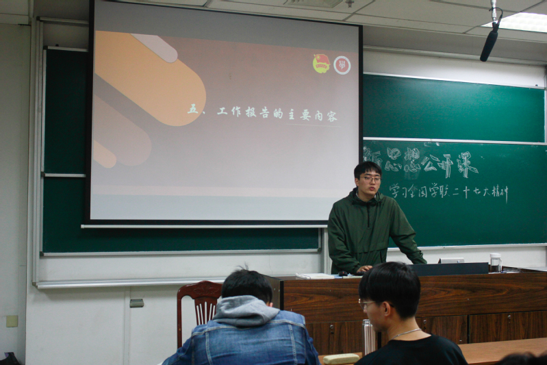 首先由黄邹洵进行了有关此次大会精神的专题报告与总结,指出本次活动意在高举习近平新时代中国特色社会主义思想的伟大旗帜,全面贯彻习近平总书记关于青年工作的重要思想和关于教育的重要论述,同时呼吁在座各位南航学子牢记习近平总书记的谆谆教诲,拼搏在新时代,奋斗在新时代,成长在新时代。