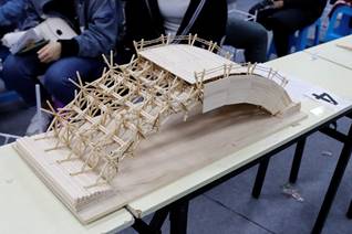 而不限材料的模型展示组中,同学们精心制作的作品也带来了惊喜,各种力学与美的结合巧妙得让人赞叹。使用木棍搭接成的桁架木拱桥(下左图),既能满足结构的承重要求,又具有很好的艺术表现力,充分体现了结构之美、建筑之美;它静默在银河下,收集星空的秘密。毫无斧凿痕迹的形体由柱式与扁平式木条搭建(下右图),流连波光云影,艺术来源于生活,却高于生活。这两个作品分别夺得了两个校区展示组特等奖。