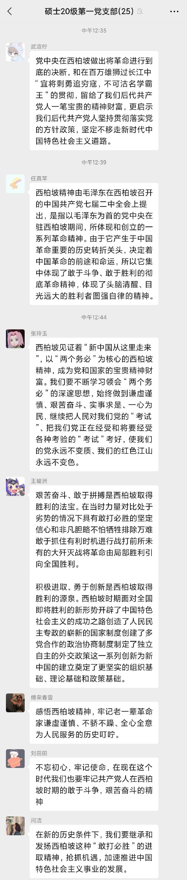 会后,支部的党员和入党积极分子深受西柏坡精神的鼓舞,纷纷在微信群中发表学习体会。