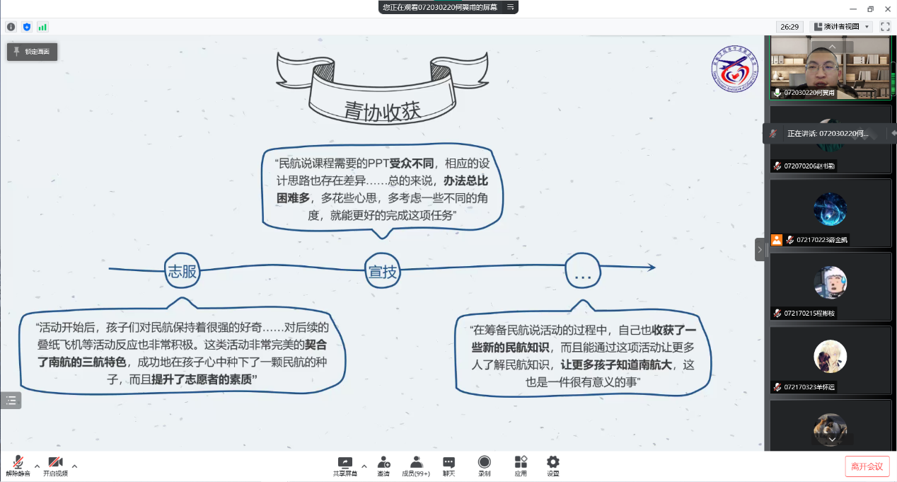 为了帮助民航学子更好地在实践中展现青年风采,在志愿服务中传递民航精神,4月9日晚,三级片 “青年行”梦想公开课在线上开展,学院2022年度寒假社会实践优秀团队及学院示范性志愿服务团队依次进行经验分享和项目推广。院团委书记赵慧文、院学生会各部门成员以及本科低年级学生参加了此次分享会。