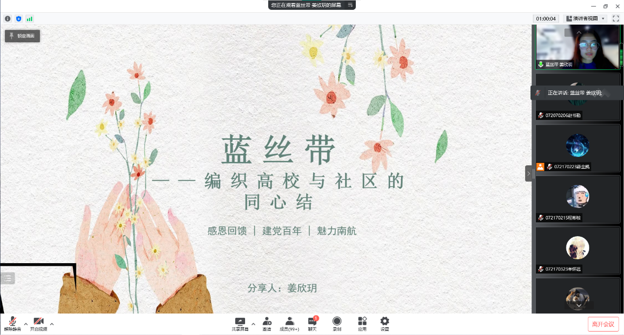 “蓝丝带”志愿服务项目诞生于党的百年华诞之际,成员们以社区志愿的形式,参与基层工作,践行青年担当。实践于学校天目湖校区附近的美景天城社区开展,并与社区自有志愿品牌“小红燕”进行合作。活动得到当地居民的热烈反响,获得十余家省市级媒体报道,同时作为大学生参与基层社区管理的示范登上了“学习强国”平台。