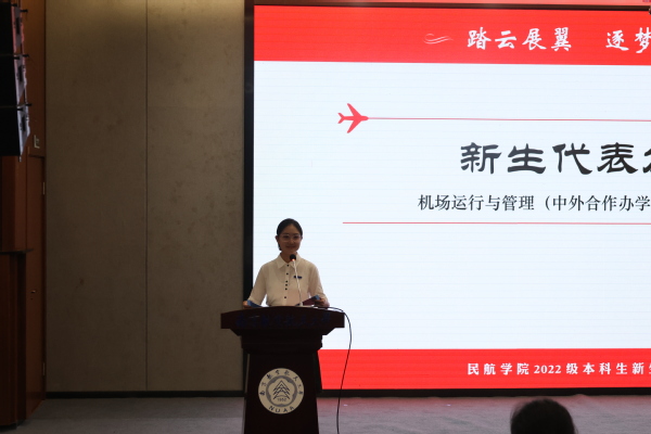 薛可馨作为新生代表发言,她以铿锵坚毅的语调分别从国防绿、民航蓝和青年红讲述自己逐梦民航的坚定决心,将和全体新生一起怀着新的喜悦、揣着新的憧憬、带着新的追求,接过民航强国的接力棒向前奔跑。