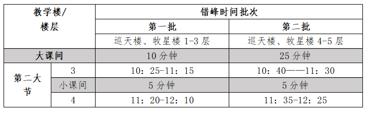 天目湖校区教学楼上午第3、4节课的上下课错峰时间仍按照原有方案执行,具体教学楼错峰上下课的时间安排见下表: