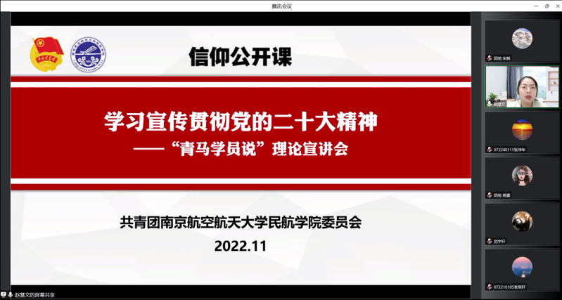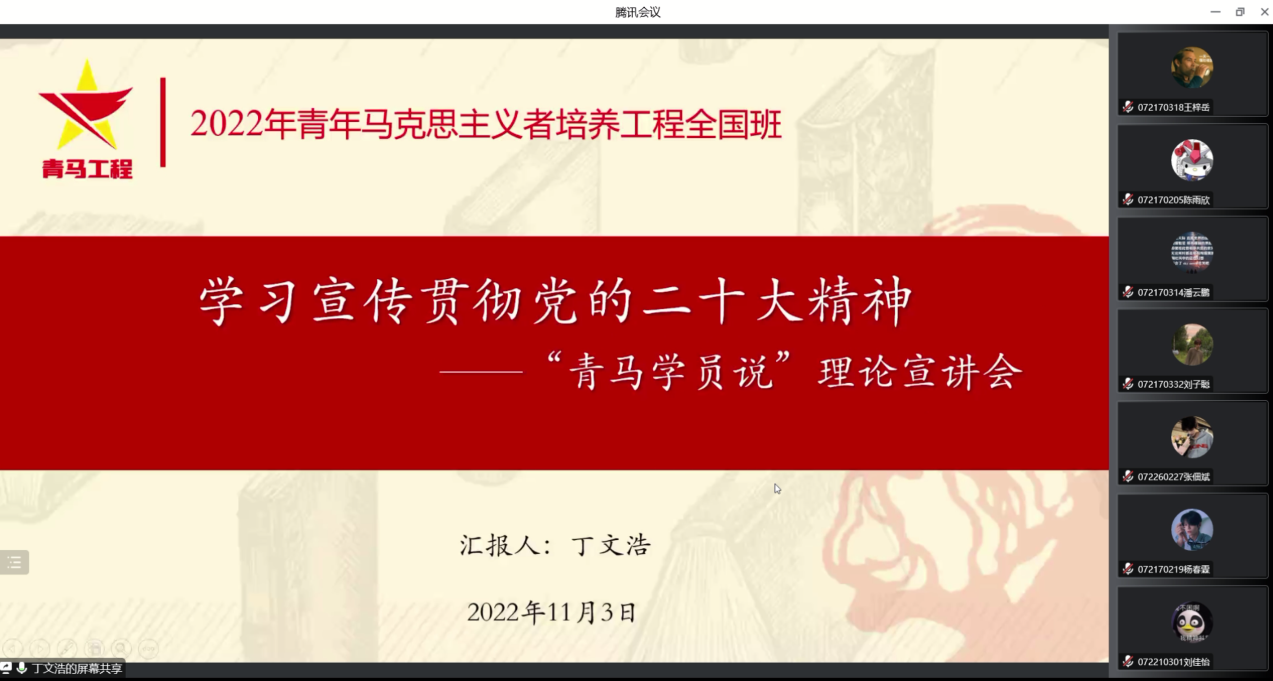 11月3日,三级片 举办青马公开课暨“青马学员说”理论宣讲会,专题学习党的二十大精神。全国青马工程高校班学员、三级片 硕士研究生丁文浩进行领学,三级片 天目湖校区全体团学骨干线上参与学习。本次活动由三级片 团委书记赵慧文主持。