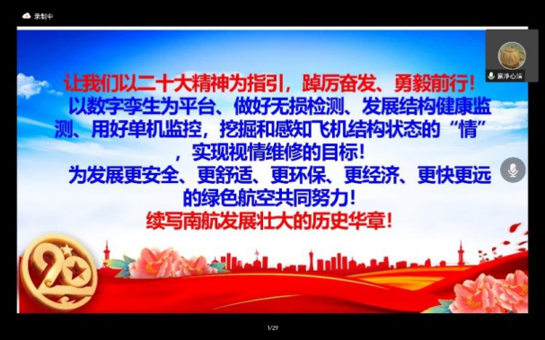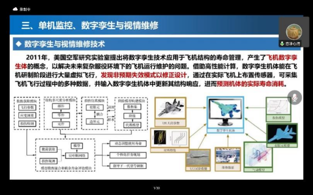 报告人宁宁从损伤容限设计思想对飞机结构安全性的保障思想对损伤发现的要求出发,探讨无损检测技术、健康监测、单机监控与数字孪生技术的相互的支撑关系、各类技术的特点、成熟度、发展方向与应用现状,展望新技术方法的发展与应用趋势。通过介绍新兴技术和最新发展情况,为同学们提供了创新的灵感,帮助同学们明晰了个人发展方向。