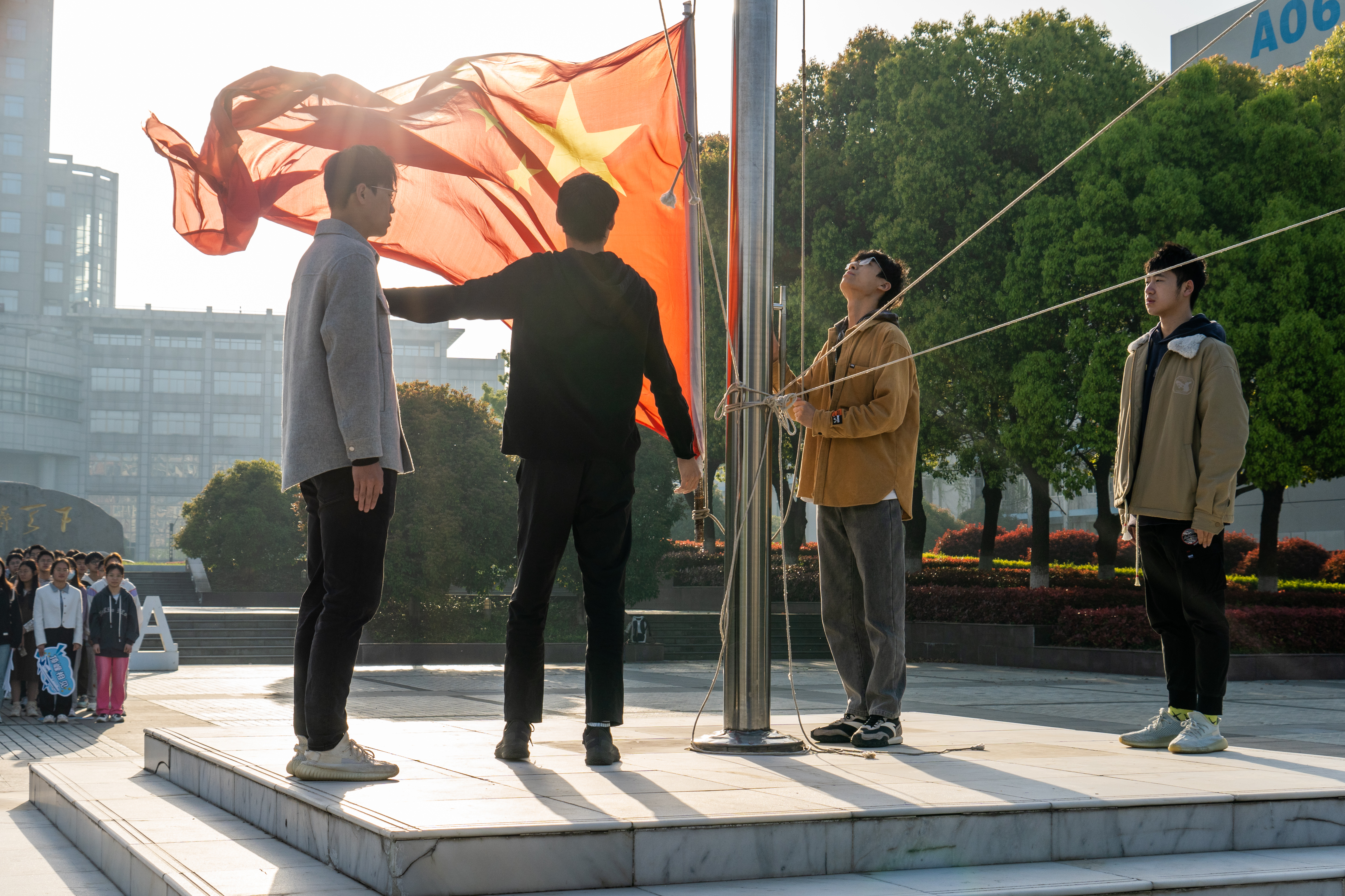 上午七时,升旗仪式正式开始。全体师生奏唱国歌,伴随着《义勇军进行曲》,学生升旗手将五星红旗冉冉升起。
