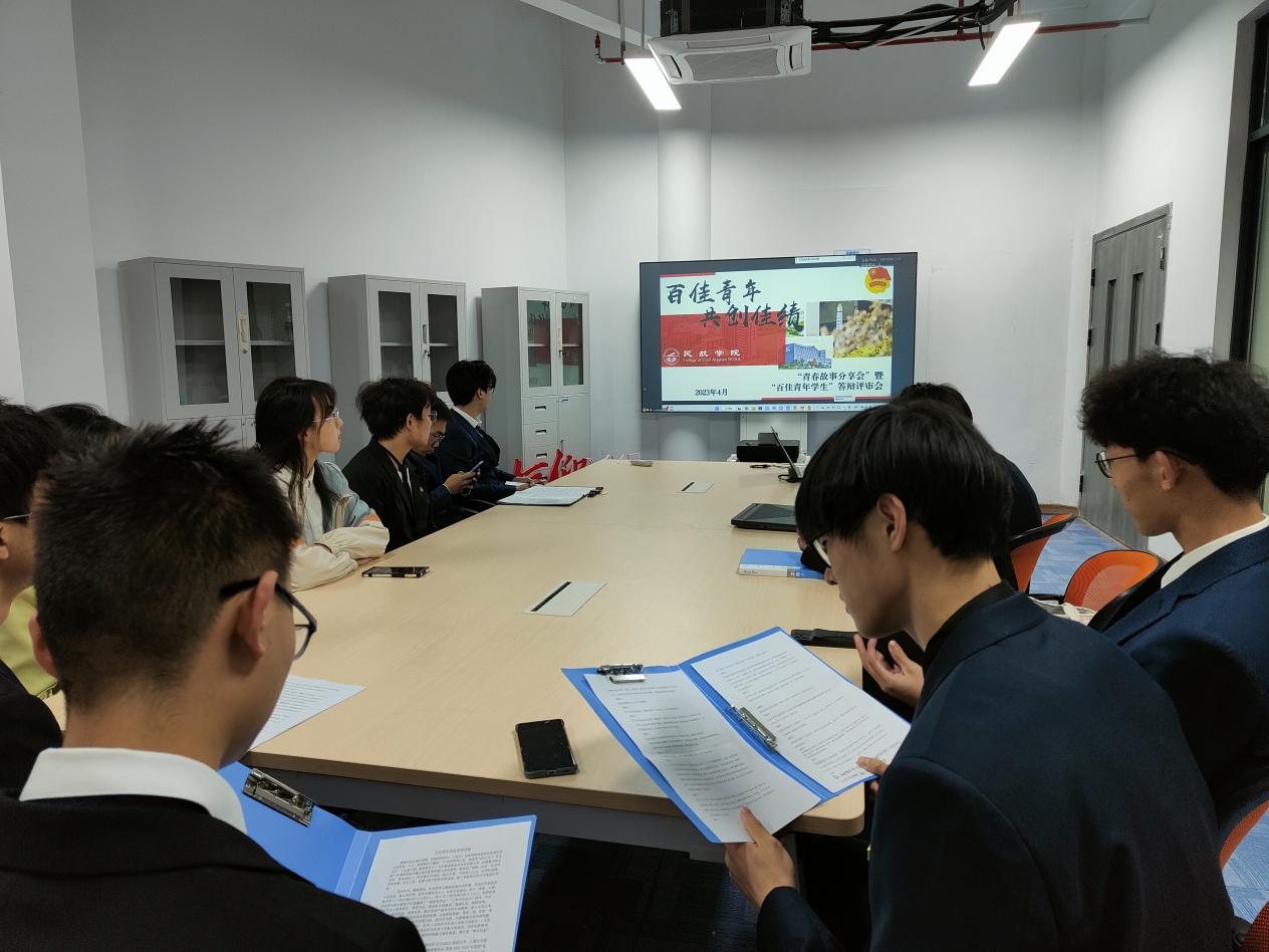于4月7日举办“青春故事分享会”主题梦想公开课暨2022年度百佳青年学生答辩评审会。来自两校区各年级的18位候选人以线上线下相结合的方式展开答辩。学院党委副书记王艳、团委书记赵慧文及各年级辅导员、学生代表参与评审,各年级学生代表在线观摩学习。
