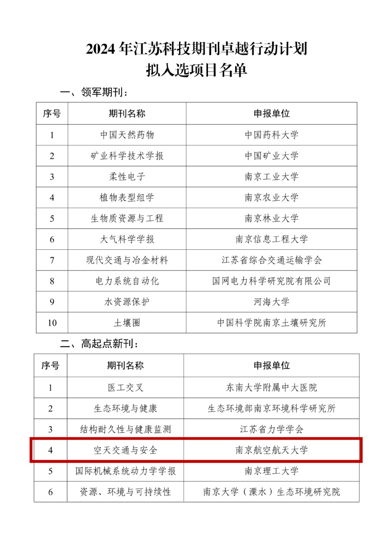 牵头主办的英文国际期刊《空天交通与安全》(《Aerospace Traffic and Safety》,ISSN: 2950-3388,简称AETS)入选2024 年江苏科技期刊卓越行动计划高起点新刊项目。