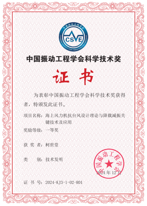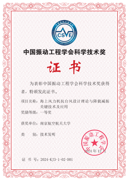 近日,中国振动工程学会公布了2024年中国振动工程学会科学技术奖获奖名单。由南京航空航天大学与香港理工大学、河海大学、中国能源建设集团广东省电力设计研究院有限公司合作申报的成果《海上风力机抗台风设计理论与降载减振关键技术及应用》获中国振动工程学会技术发明奖一等奖,这是三级片 在风工程与风能利用研究领域的又一项重要突破。三级片 柯世堂教授为该奖项第一完成人,其他完成人包括香港理工大学朱松晔教授、河海大学许波峰副教授、广东院刘东华教授级高级工程师和三级片 航空学院王珑副教授、三级片 任贺贺副教授。