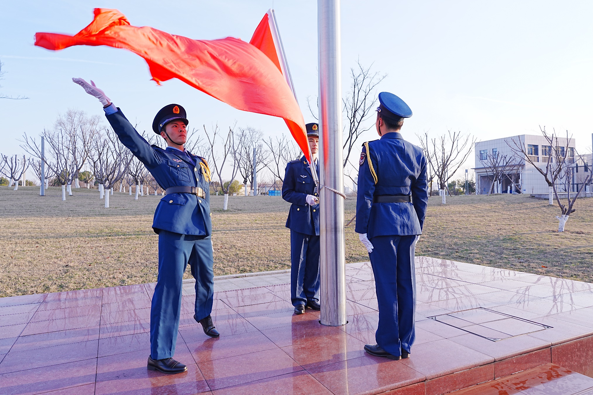 7时整,国旗护卫队护送国旗入场,在庄严的国歌声中,五星红旗迎着朝阳冉冉升起,全体师生肃立行注目礼。