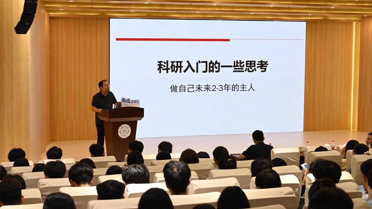 杜文博以“做自己未来2-3年的主人”为核心开篇,结合自身科研经历与团队培养实践,从科研认知、心态建设、行动执行等多个维度进行了分享。通过分析《Nature》《Science》经典期刊上交叉研究案例,他向师生阐释了科研入门并非局限于单一形式,参观实验室、阅读论文、聆听学术报告等都是重要的起步环节,而核心在于思维能力的系统训练。他建议同学们“不跟风,做水准以上的研究”,不盲目追逐AI、大模型等热点,而是要在结合方法创新的同时立足解决问题本质。