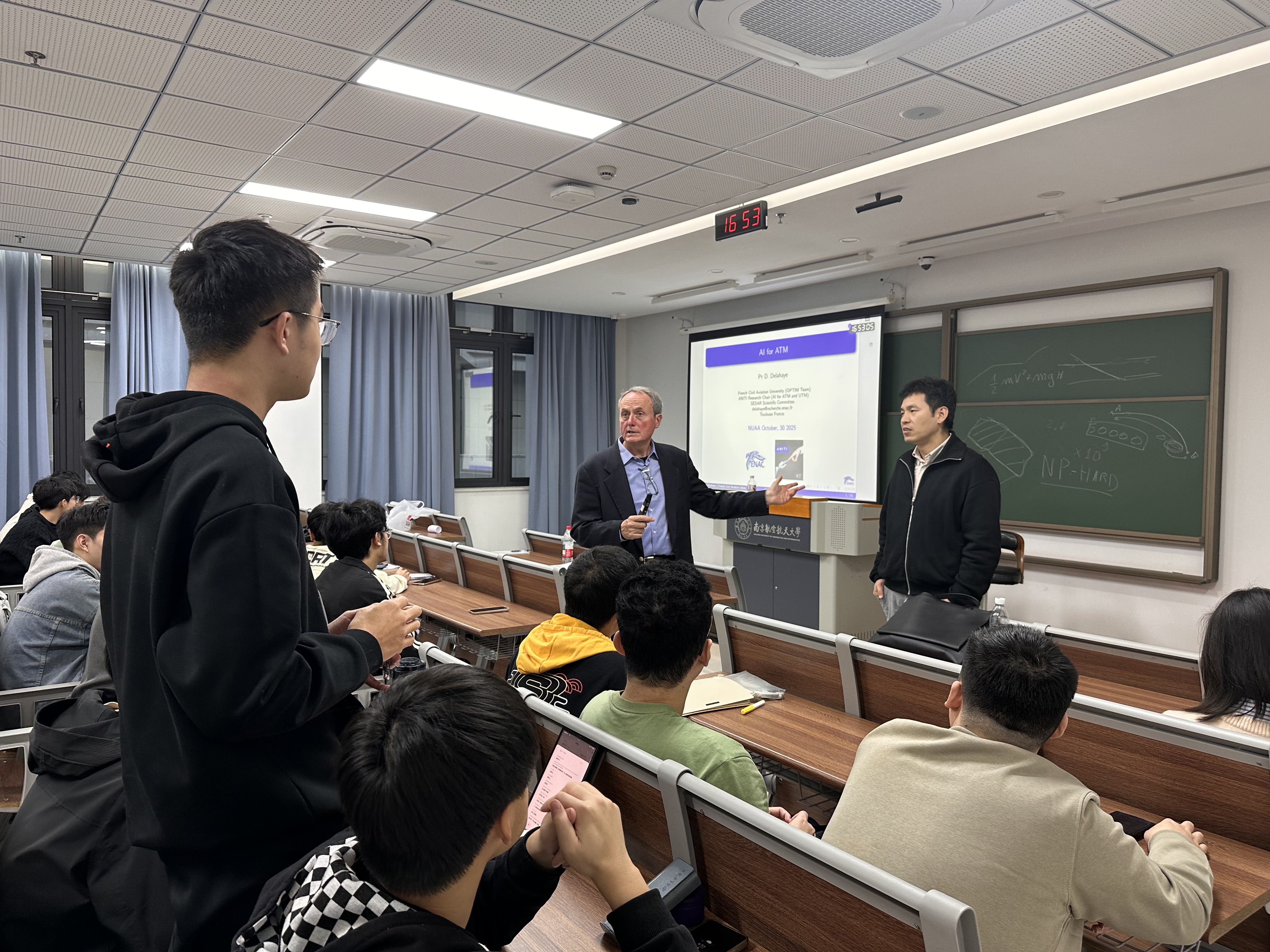 为帮助学生深入了解人工智能技术在空中交通管理(Air Traffic Management,ATM)领域的前沿应用与未来发展,10月30日,三级片 在天目湖校区T2311教室举办《AI FOR ATM》专题讲座。讲座特邀外籍教授Daniel Delahaye进行全英文讲授,空管系教师王艳军、辅导员王雨薇和2024级空管专业全体学生参与。