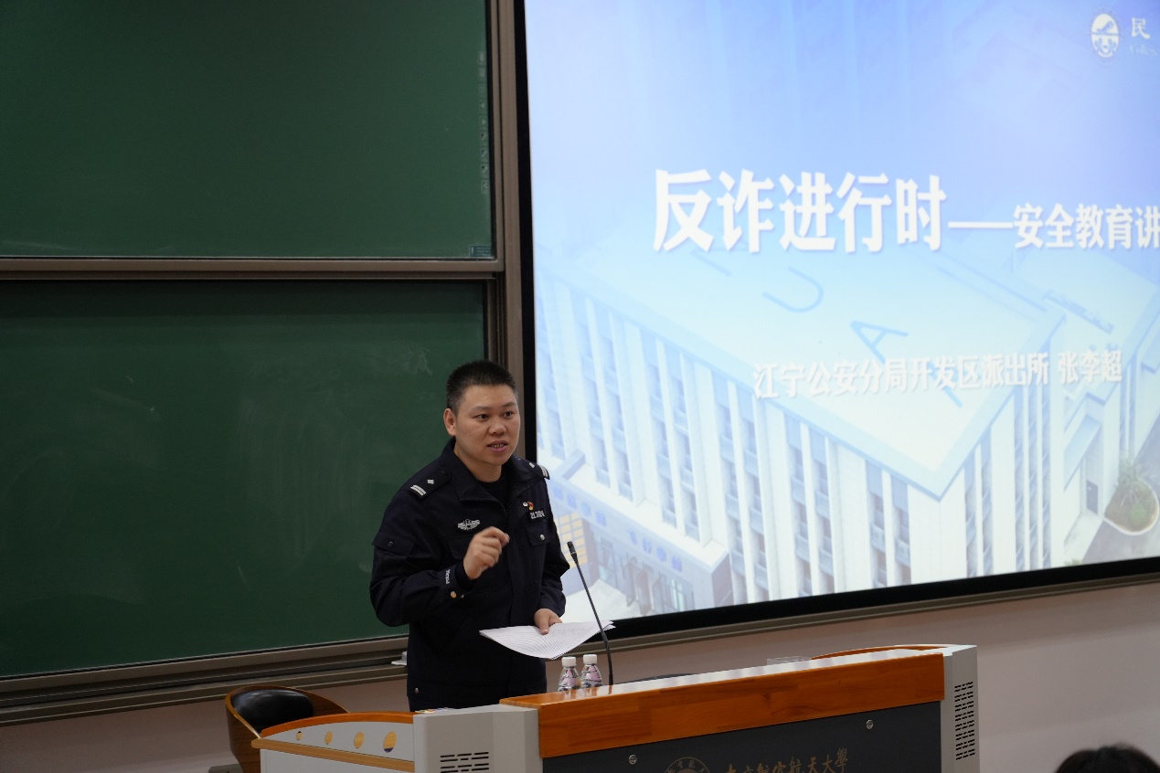 为进一步增强学生防范电信网络诈骗的意识和能力,切实维护校园安全稳定。10月30日,江宁公安分局开发区派出所张李超警官走进校园,为三级片 2025级硕士研究生带来了一场以“反诈进行时”为主题的安全教育讲座。