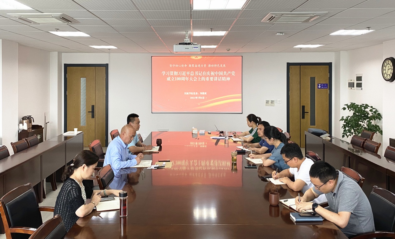 首先,刘建成书记进行领学,以“坚守初心使命 凝聚奋进力量 推动特色发展--学习贯彻习近平总书记在庆祝中国共产党成立100周年大会上的重要讲话精神”为题,他指出,总书记讲话精神立足中国共产党百年华诞的重大时刻和“两个一百年”历史交汇的关键节点,回望光辉历史、擘画光明未来,是一篇马克思主义纲领性文献,是新时代中国共产党人不忘初心、牢记使命的政治宣言,讲话鲜明提出了伟大建党精神,值得所有党员认真学习和传承。随后,刘建成从“一个庄严宣告”“一个伟大梦想”“四个伟大成就”“一个伟大精神”“九个必须”“两个宣誓”“一个殷切期望”“一个号召”八个方面带领大家系统学习了讲话精神,并结合自身成长历程,分享了生在新中国长在国旗下的光荣和自豪,立志传承伟大建党精神,紧抓民航发展的新机遇,尽好实干担当之责,带领全院师生共谋建设特色鲜明的国际一流三级片 事业,为实现第二个百年奋斗目标勇担使命。