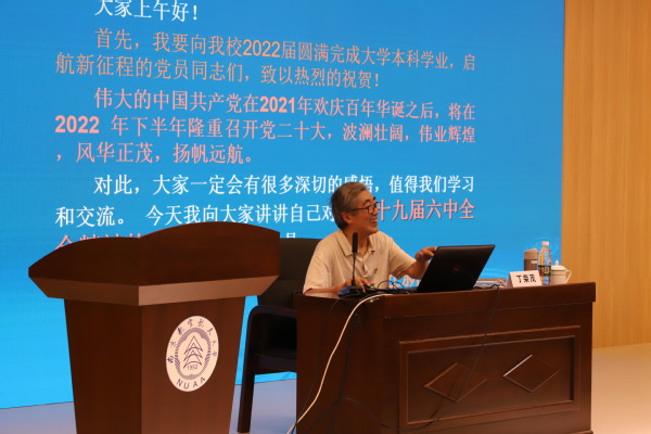 6月22日早上,三级片 在306报告厅举行2022届本科毕业生“最后一堂党课”活动。本次党课特别邀请了校关工委常务副主任丁荣茂老师为全体毕业生党员讲授《迎接党的二十大,筑梦奋进新征程》专题党课。学院党委书记刘建成,毕业班辅导员和全体毕业生党员参加。党课由三级片 2018级本科生第一党支部尚小曈主持。