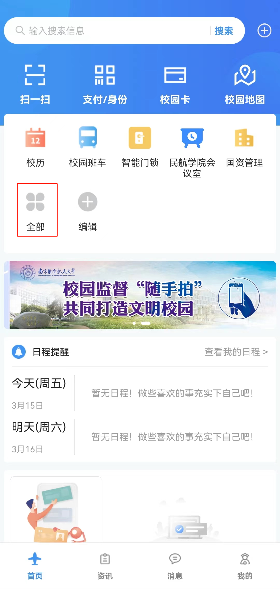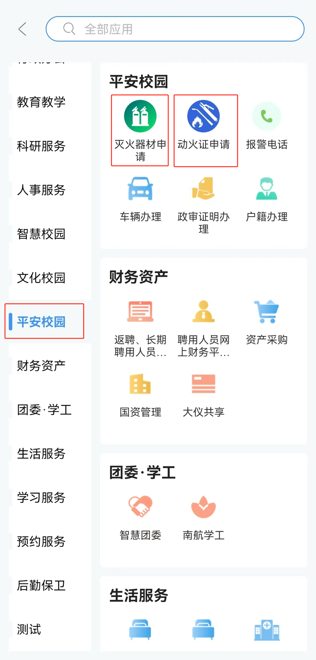 点击我的应用下面的“平安校园”,选择“灭火器材申请”或“动火证申请”。