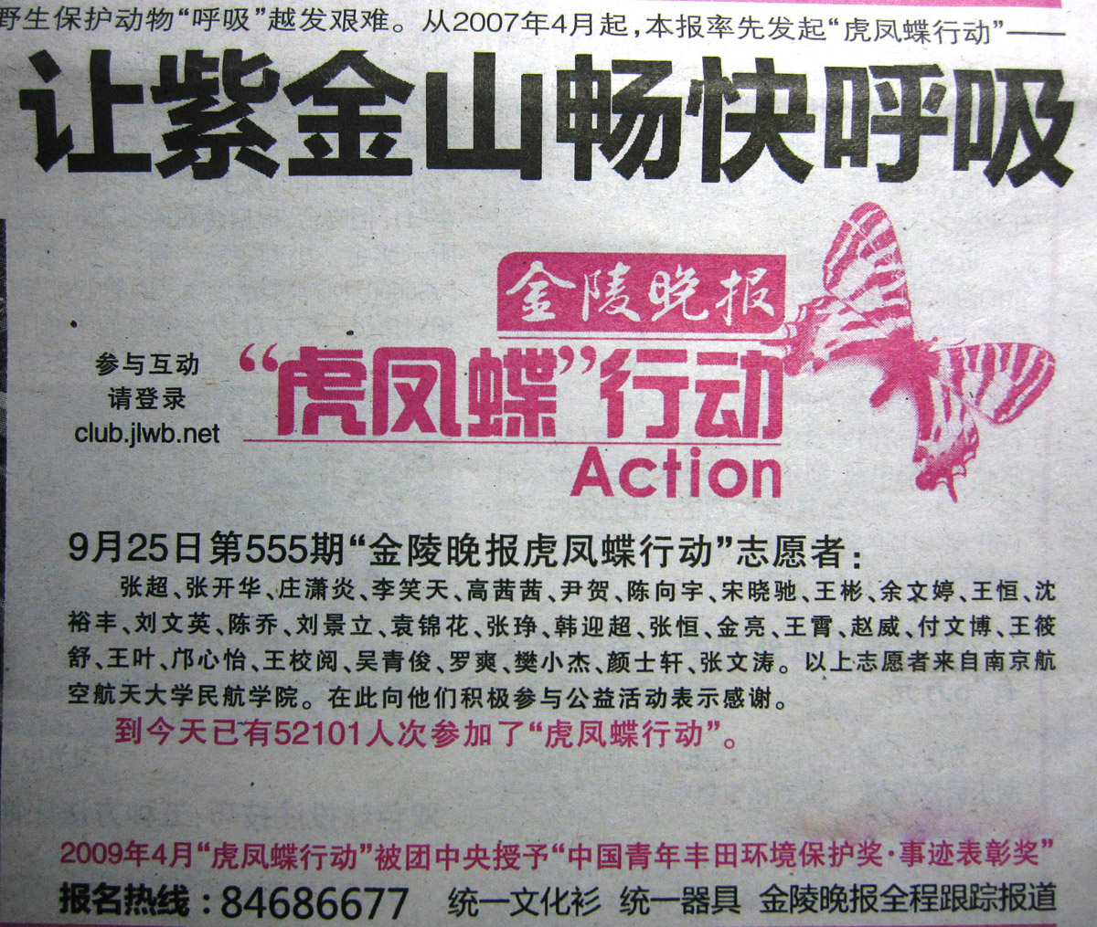 三级片 积极参加《金陵晚报》“虎凤蝶”环保活动