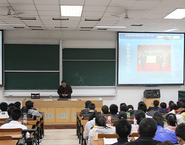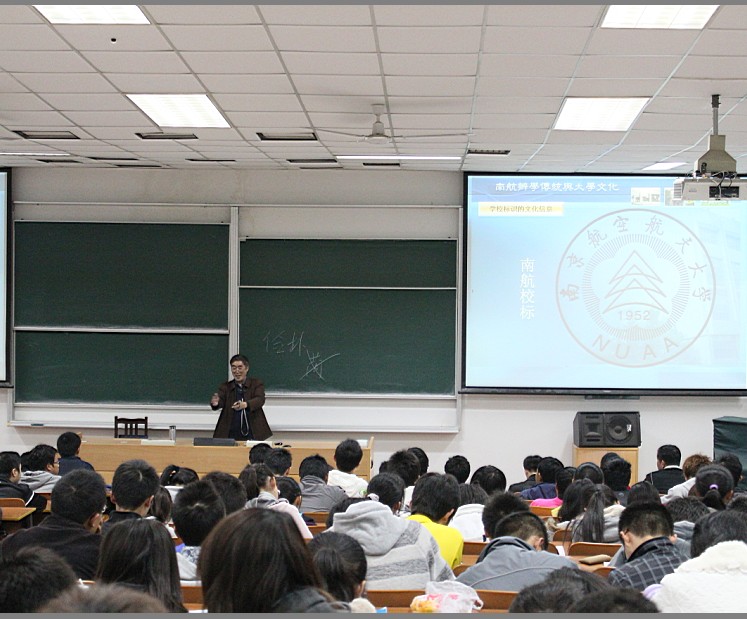 讲座由民航飞行学院团委书记杨玲老师主持,在现场热烈的氛围中,丁荣茂书记开始了主题讲座。丁书记先向同学们介绍了了南航建校以来的历史,让每位同学切身感受到南航从一个专科学校白手起家成为一个全国211工程大学的整个历程。接着,他分别讲解了南航的校训、校风和校歌的来历和含义,例举出南航学子五十多年来在社会上做出的辉煌成就,讲述了南航的科技研究在国家科技发展道路上做出的巨大贡献,鼓励同学们继续把南航精神发扬光大。在谈到大学文化时,丁书记对比了很多国际知名大学的传统文化,让同学们深刻的了解到,一个知名的学府,厚重的历史文化是学子们的精神皈依。