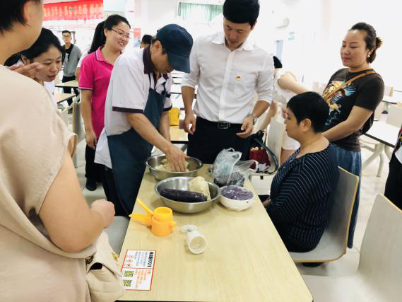 活动开始前,餐饮中心的工作人员提前为我们准备好了面团、馅料以及模具等必需品,并且为大家演示了月饼的制作过程。随后,大家都饶有兴致地动起手来,精心制作起第一块月饼。