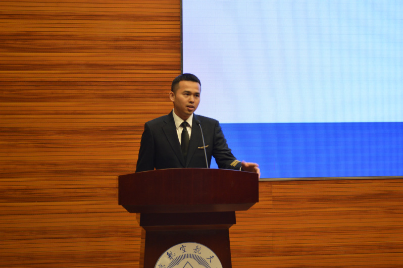 南航广西分公司的B737 A类机长胡克家作为机长代表发言,在讲话中,他表示感谢母校与恩师的栽培,感激深厚的同学情谊,感想十年蜕变,感怀过往经历。最后,他深深地祝福在座的学员们身体健康,飞行顺利。